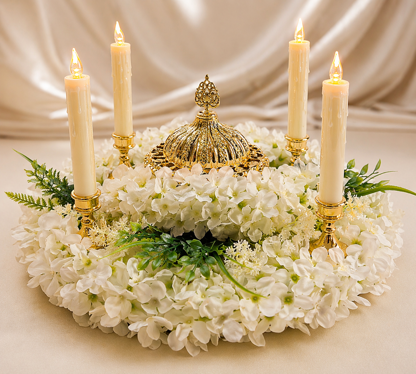 Beyaz Çiçekli Gold Şamdanlı Kına & Nişan Tepsisi – Elegant Garden Serisi