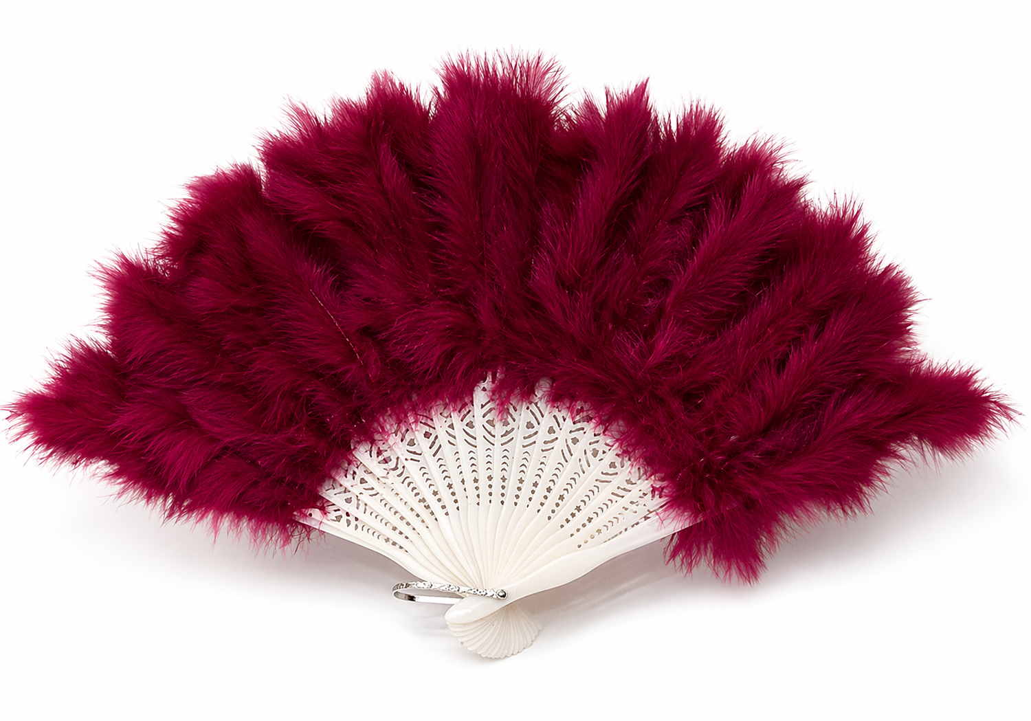 Bordo Tüylü El Yelpazesi – Oymalı Saplı Şık Davet & Dans Yelpazesi