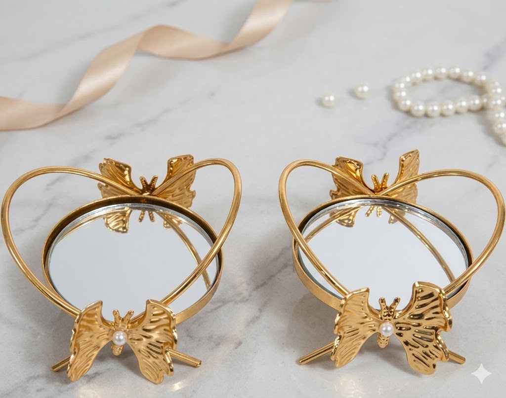 İkili Fiyonklu Yüzük Yükseltici – Gold Aynalı Dekoratif Yüzük Standı, Nişan & Söz Yüzük Sunumu