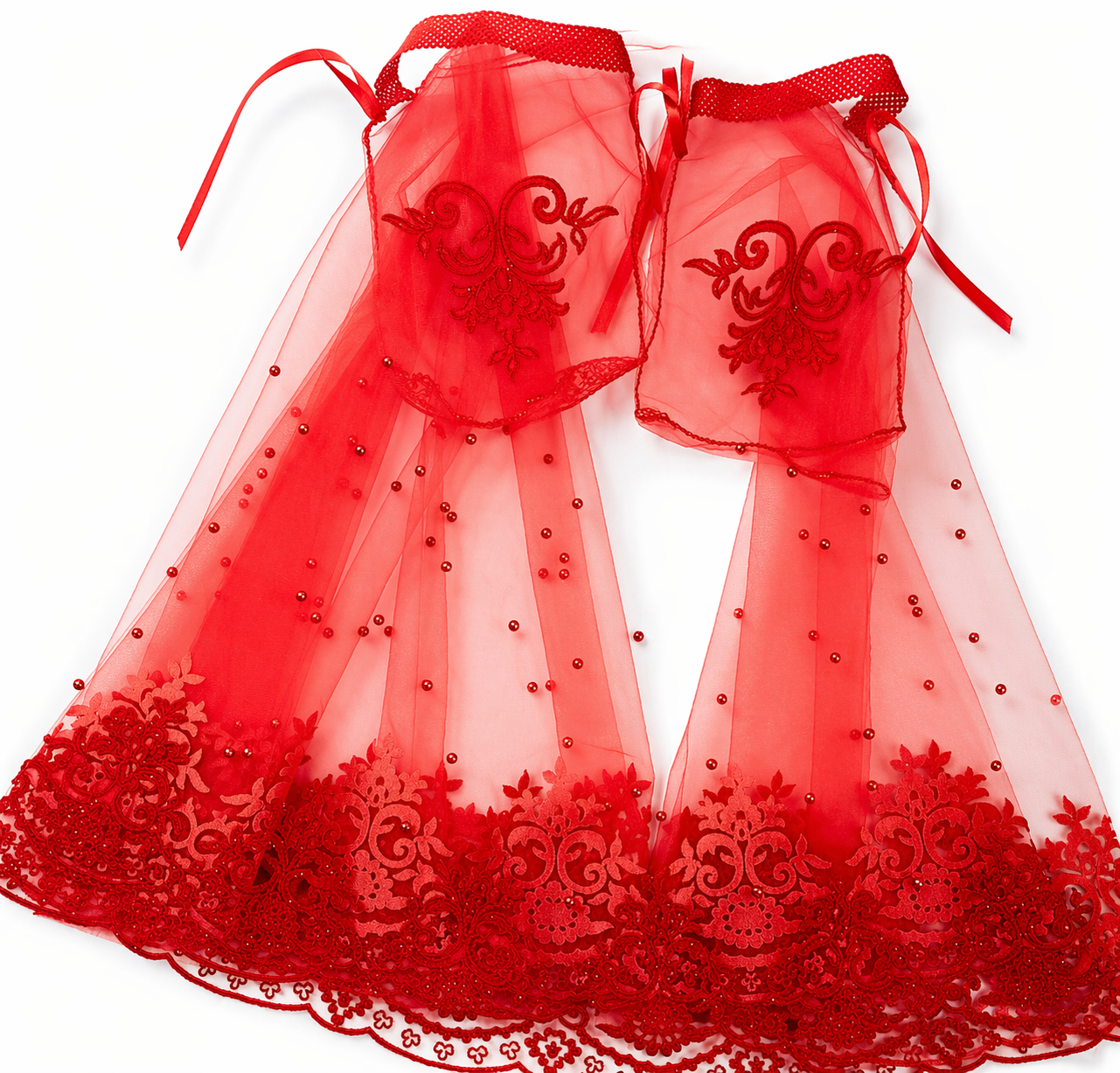 Kırmızı İnci Detaylı Tül Gelin Kemeri ve Çift Parça Omuz Şalı Seti – Kına Gecesi Özel Tasarım