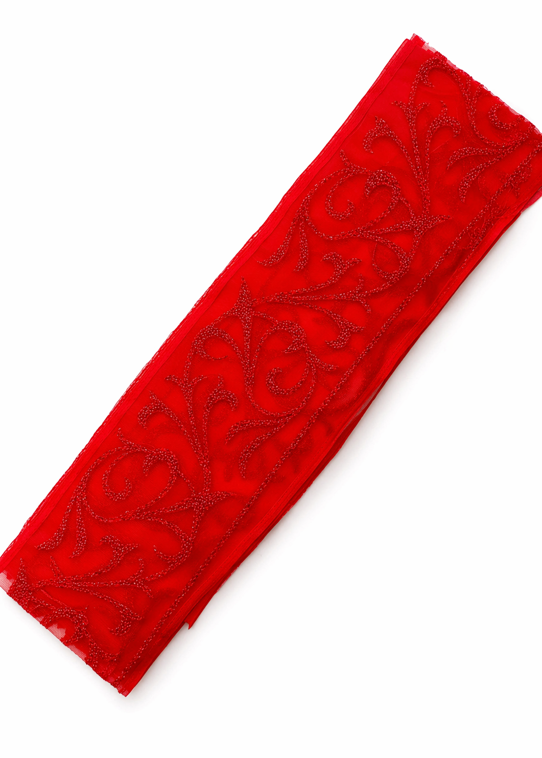 Zarif nakış detaylarıyla tasarlanan kırmızı gelin kemeri, özel günlerde şıklığınızı tamamlayan göz alıcı bir aksesuardır. İnce ve hafif tül yapısı sayesinde rahat kullanım sunarken, üzerindeki işlemeler ürüne zarif ve estetik bir görünüm kazandırır.