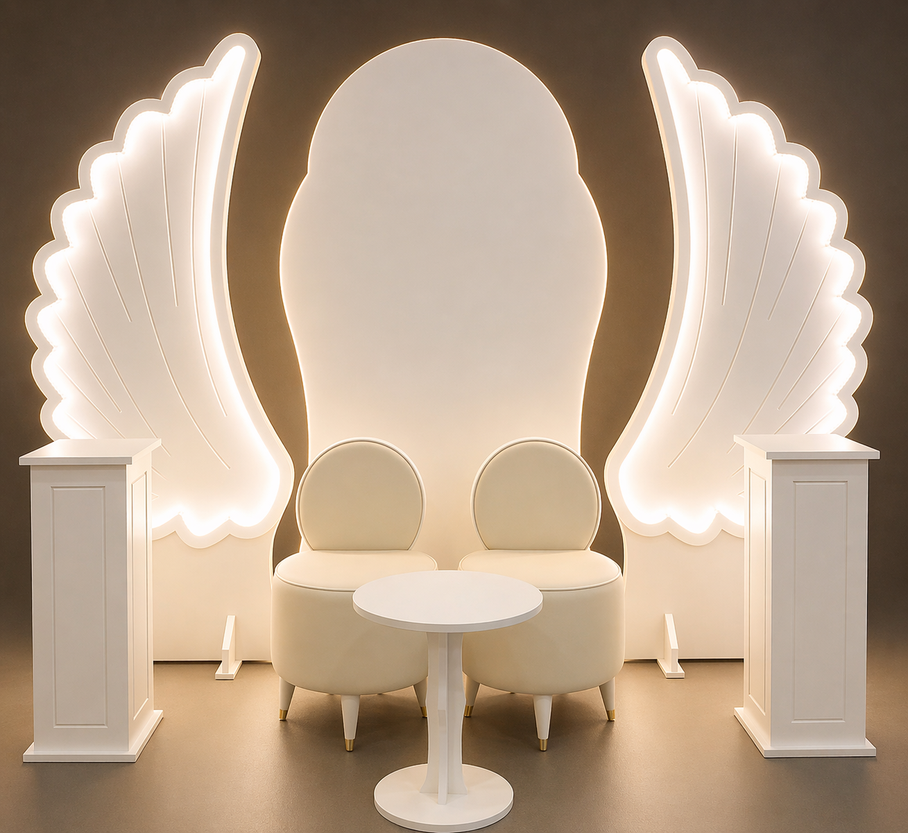 Melek Kanatlı LED Arka Fon Seti – Işıklı Düğün & Nişan Sahne Dekoru (Oturma Setli)
