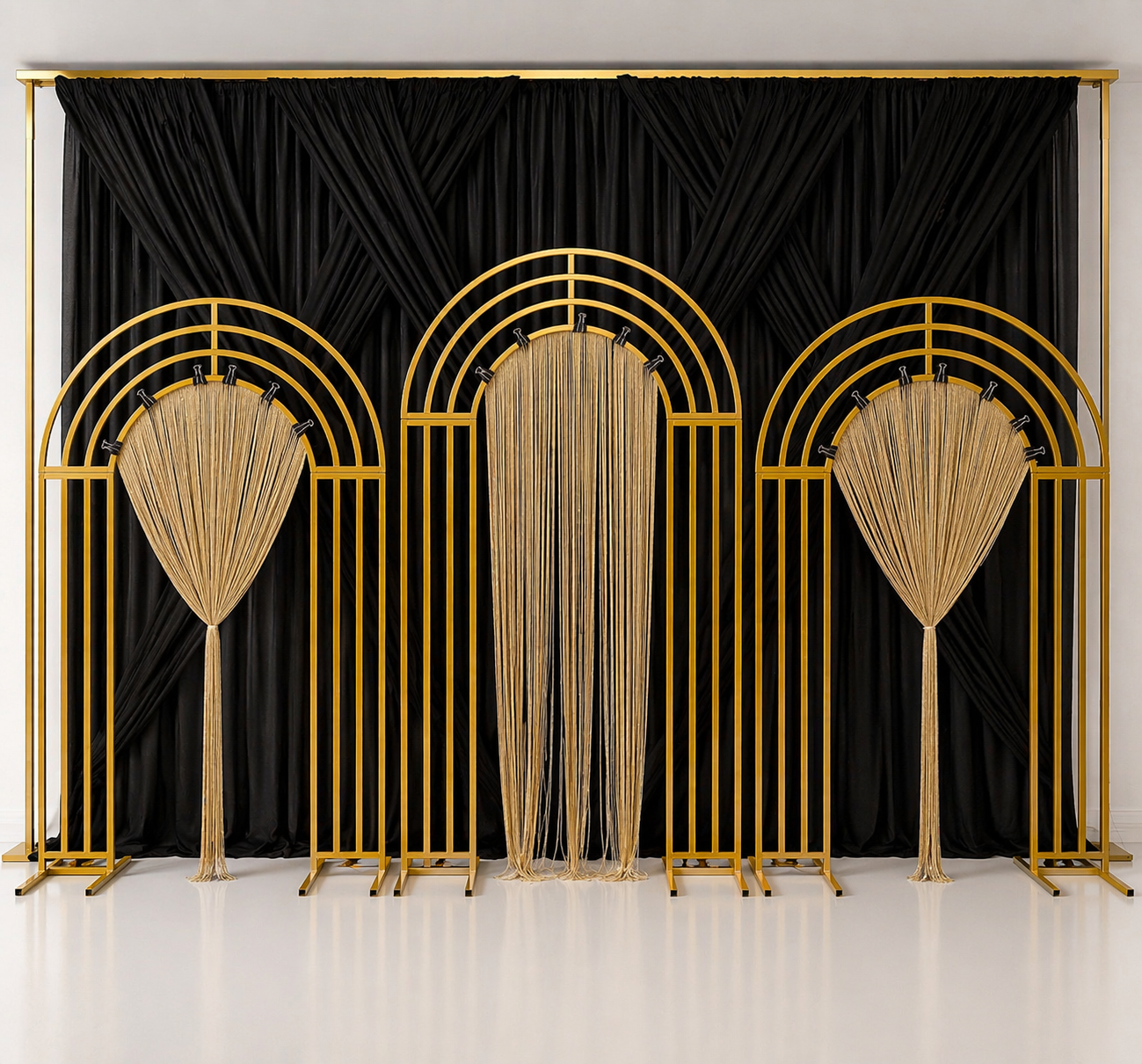 Metal Sirius + Hasır Simli Şerit Arkafon Seti – Gold Kemerli Arka Plan Dekoru