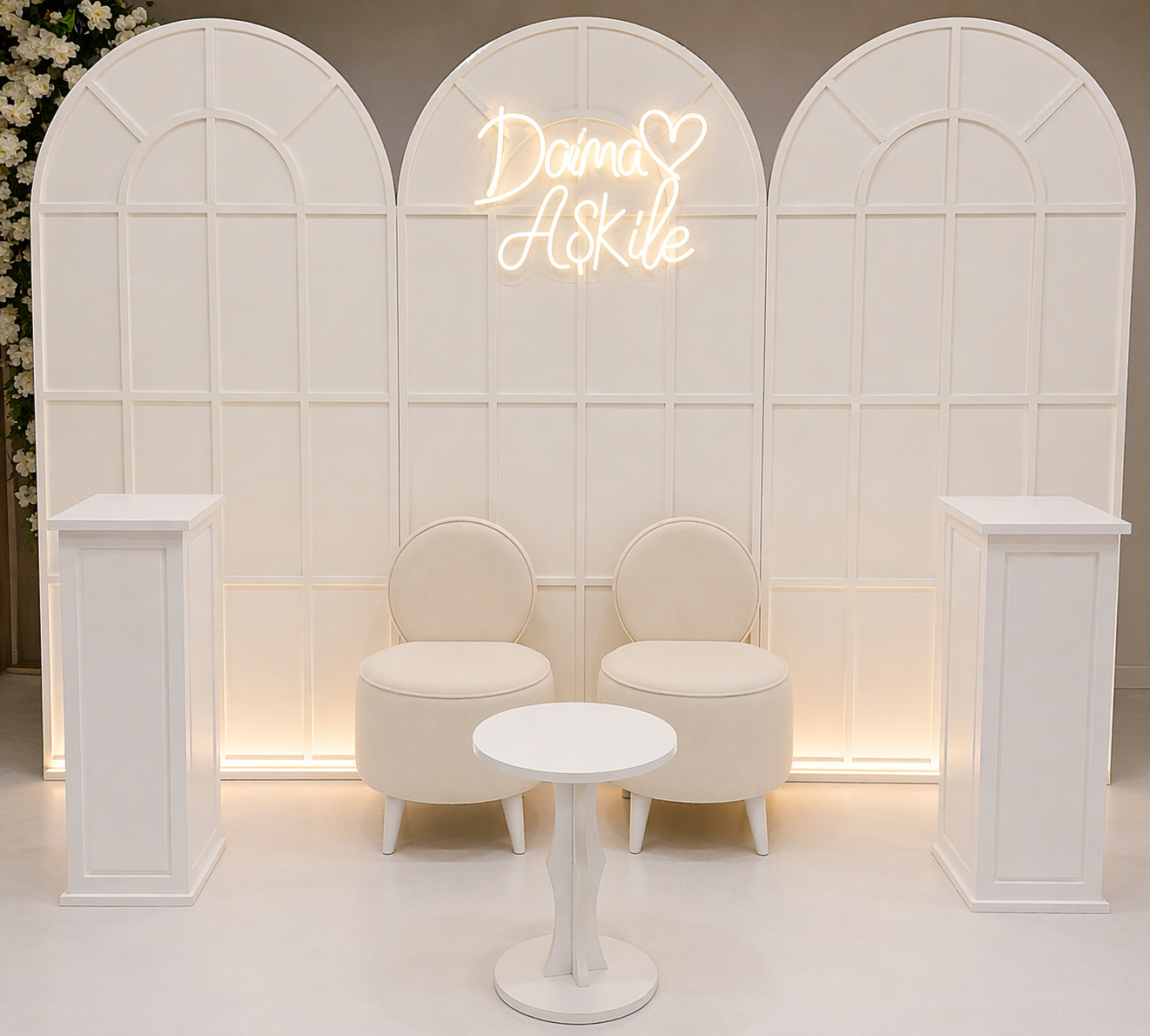 Set içerisinde bulunan 3’lü arka fon paneli, ikili koltuk, orta sehpa ve dekoratif sütunlar, konseptinizi tamamlayarak profesyonel bir görünüm sunar. LED aydınlatmalı neon yazı, ortama sıcak ve romantik bir ambiyans katarak fotoğraf ve video çekimlerinde etkileyici sonuçlar elde etmenizi sağlar.
