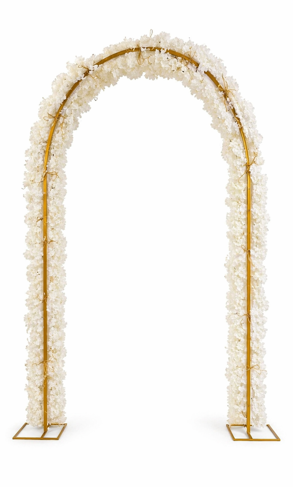 Oval gelin yolu, zarif kemer formu ve yoğun çiçek süslemeleri ile düğün ve özel davet organizasyonlarında göz alıcı bir atmosfer oluşturur. Gold renkli metal iskelet üzerine yerleştirilmiş beyaz çiçek detayları, mekâna romantik ve şık bir hava katar.