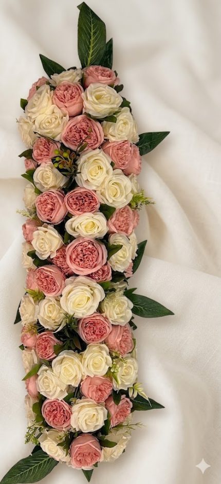Pastel tonların uyumuyla hazırlanmış bu pembe-beyaz yapay gül şerit, özellikle zarif ve romantik konseptlere sahip organizasyonlarda tercih edilir.
