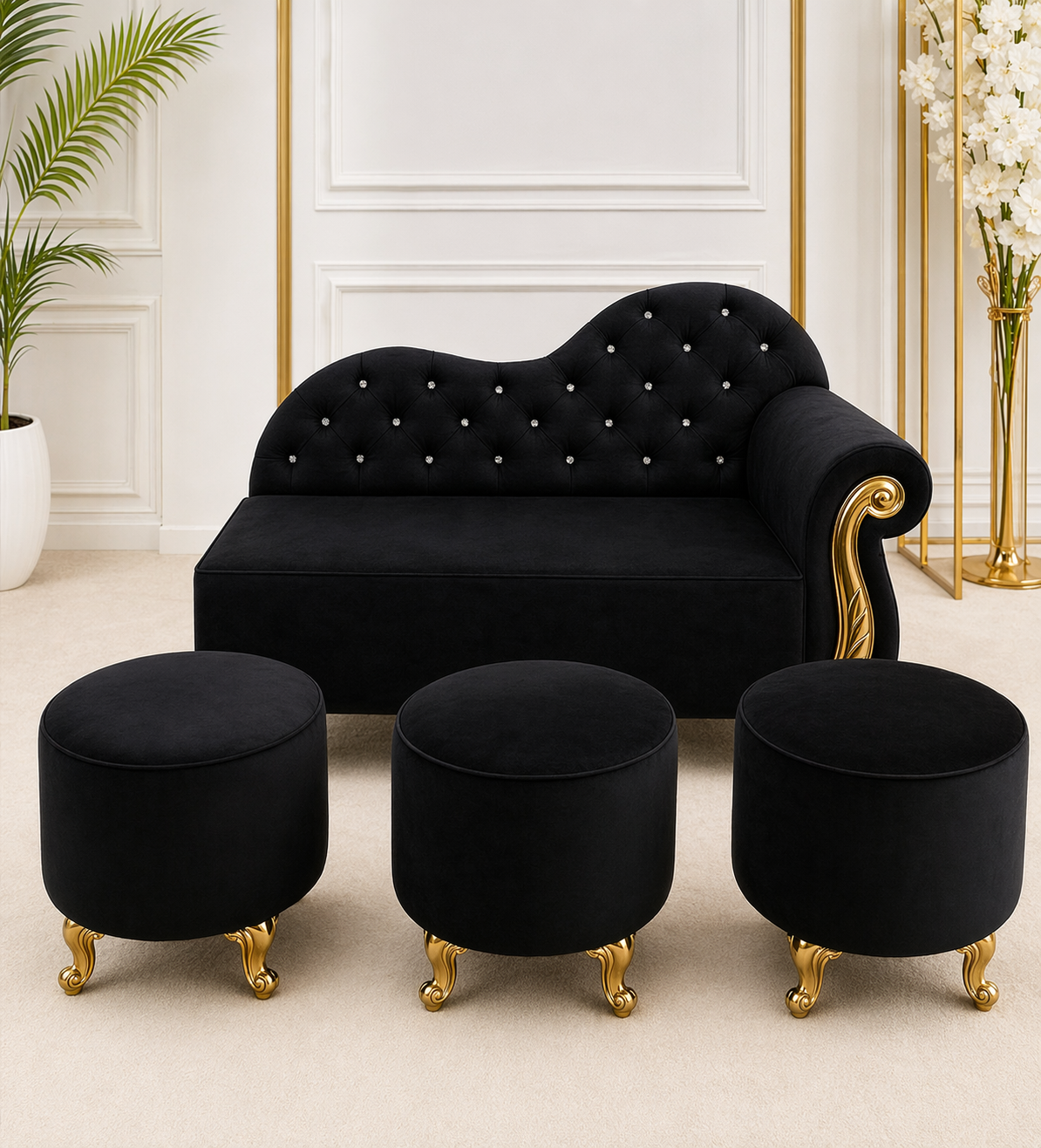 Şıklığın ve asaletin en güçlü yansıması olan Siyah Kapitoneli Koltuk ve Puf Takımı, özel günlerinizde göz alıcı bir atmosfer oluşturur. Modern ve klasik tasarımın mükemmel uyumunu sunan bu set, zarif kapitone detayları ve altın renkli kol/ayak işlemeleri ile lüks bir görünüm sağlar.