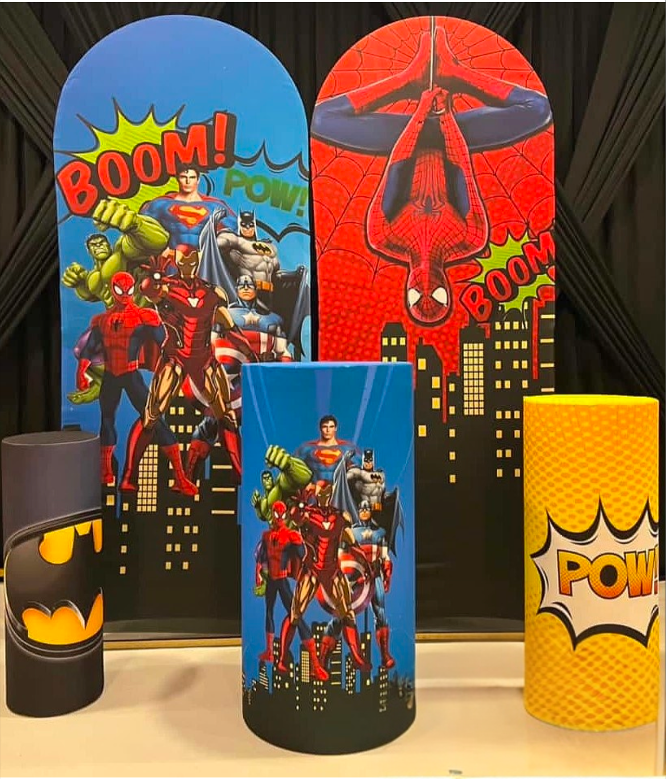 Süper Kahraman Temalı Çocuk Puf & Dekoratif Panel Seti – Çizgi Roman Desenli Silindir Oturak | Erkek Çocuk Odası Dekoru