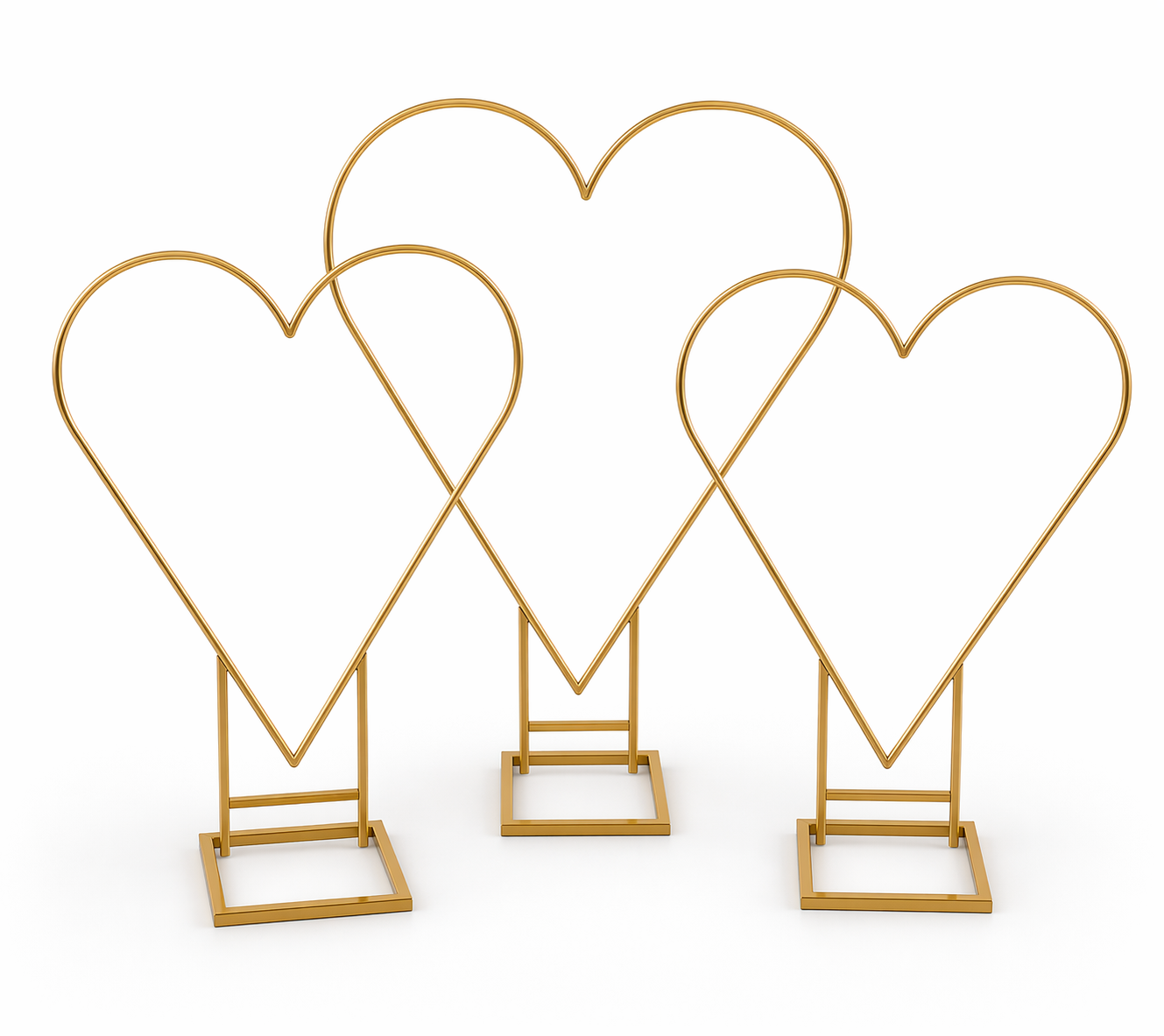 Üçlü Kalp Tag Standı – Gold Metal Kalp Arka Fon Seti