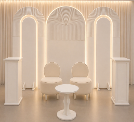 Zirve Tahtı, geleneksel taht tasarımlarına modern bir yorum getirerek ihtişamı ve zarafeti bir araya getiriyor. Yukarıya doğru yükselen, çok parçalı sırt formu ve altın renkli detaylarıyla organizasyonlarda göz alıcı bir odak noktası sunar.