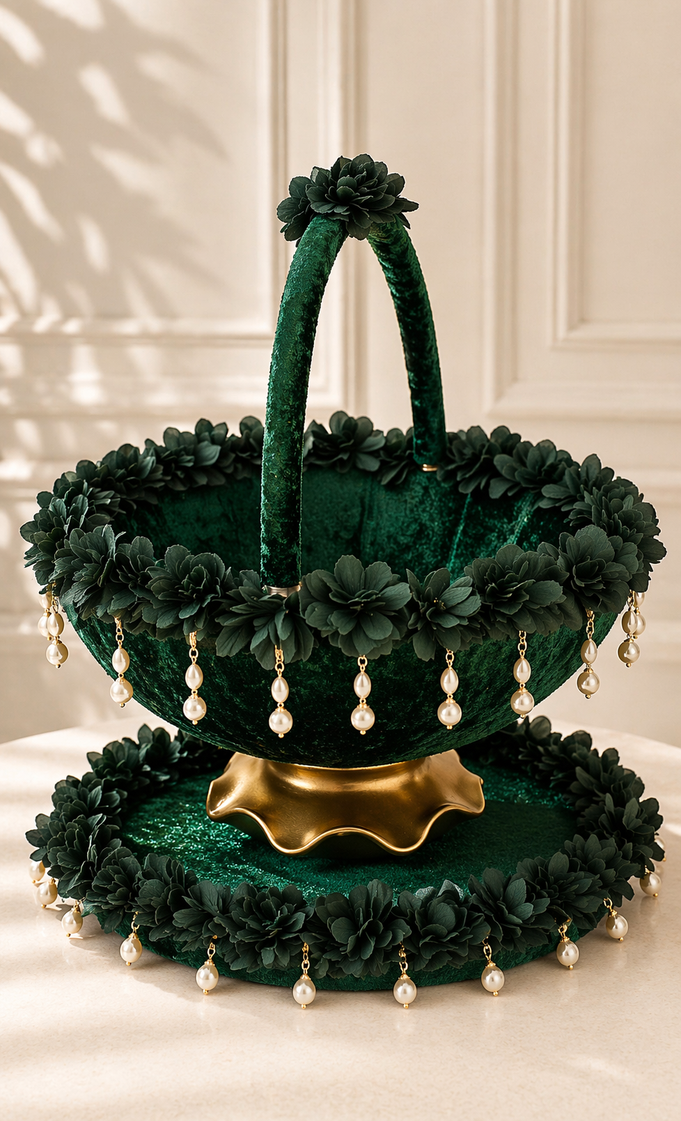 Zarif ve asil tasarımıyla öne çıkan bu zümrüt yeşili kadife nişan sepeti, özel günlerinizde şıklığı ve zarafeti bir arada sunar. Kadife dokusu, yoğun çiçek süslemeleri ve sarkan inci detayları ile göz alıcı bir görünüm sağlar.
